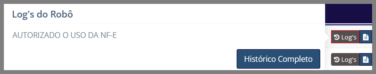 • Log’s: Permite acessar as informações do histórico da nota fiscal. Ao clicar, é exibido um pop-up com o resumo do último registro feito pelo Robô Jarvis de faturamento, referente ao status da transmissão da nota fiscal para a SEFAZ.