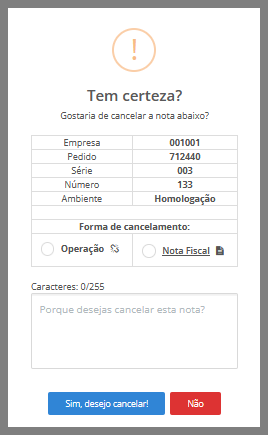 Independente da opção selecionada, é obrigatório informar o motivo do cancelamento da nota fiscal, com no mínimo 15 caracteres. Além disso, após a confirmação, o status da nota fiscal será alterado para Cancelado.