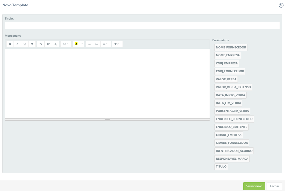 - Mensagem: Insira o conteúdo do template que será salvo. É possível arrastar parâmetros para dentro da caixa de texto, os mesmos serão substituídos ao emitir o acordo.