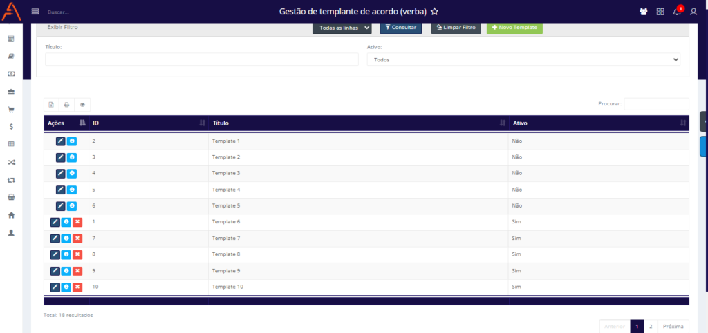 Ao acessar a tela de Gestão de Templates de Acordo, é possível visualizar os templates existentes no sistema. Para isso, o usuário pode clicar no botão “Consultar”, visualizando assim todos os registros inseridos. Caso o usuário queira especificar qual template ele está buscando, também é possível personalizar por meio dos filtros “Títulos” e “Ativo”.