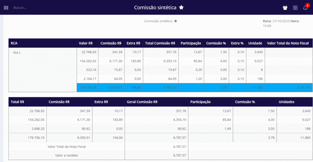 - Participação: Exibe a porcentagem que representa a comissão (incluindo o extra) em relação ao valor total das vendas.