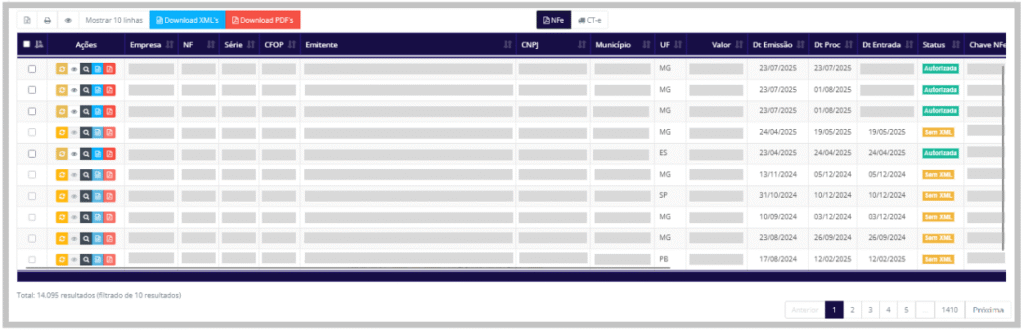 Download XMLs: Ao clicar, é possível baixar os arquivos XML de todos os documentos fiscais selecionados.