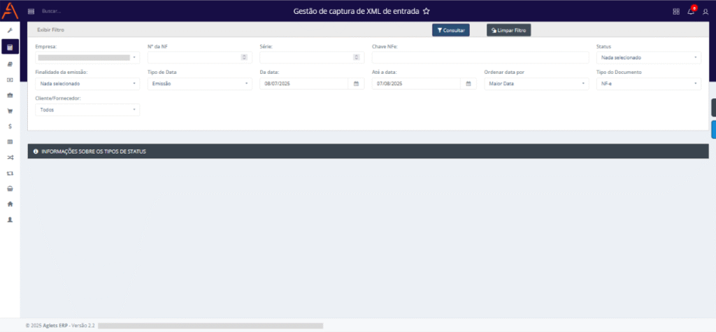 No sistema da Aglets ERP, acesse Controladoria > Operações > Gestão de captura de XML de entrada, ou digite “Gestão de captura de XML de entrada” na barra de pesquisa no topo da página.