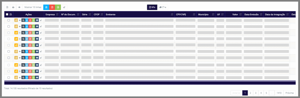 • Ações: Exibe os ícones das ações disponíveis para auxiliar na visualização das informações dos documentos fiscais. A seguir, veja mais detalhes sobre essa funcionalidade:
