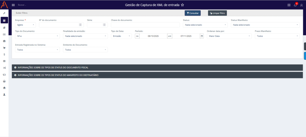 Atenção: A tela Gestão de captura de XML de entrada está disponível somente para clientes que contrataram o serviço separadamente. Se desejar utilizar esse recurso, entre em contato com o setor comercial da Aglets ERP para obter mais informações sobre como contratá-lo.