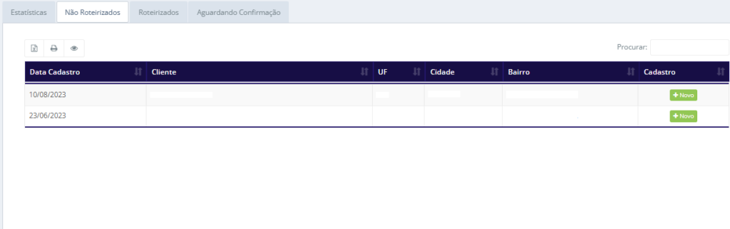 • Cadastro: O botão “Novo” permite ao usuário fazer a roteirização do cliente.
