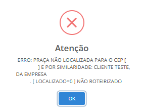 Esta mensagem indica que o CEP do cliente não está vinculado a nenhuma faixa de CEP ou foi inserido de forma incorreta.