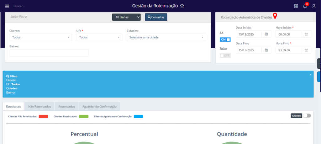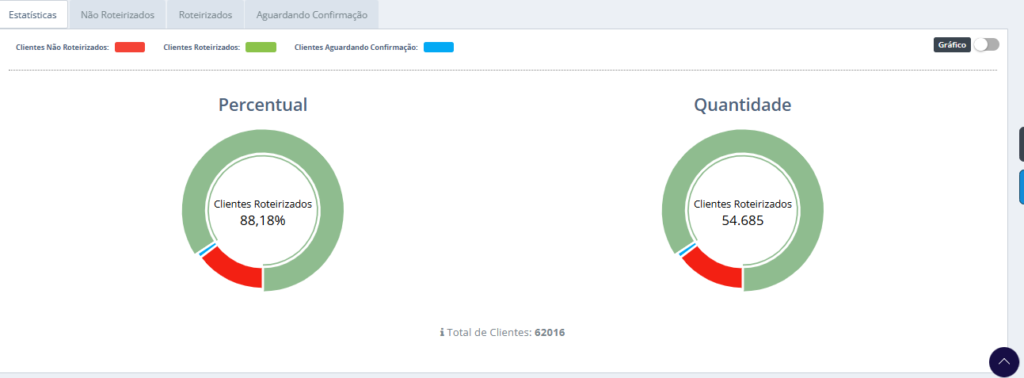 Visualização em formato de gráfico: Apresenta os dados por meio de representações visuais, destacando informações como Percentual e Quantidade de clientes roteirizados, não roteirizados e aguardando confirmação.