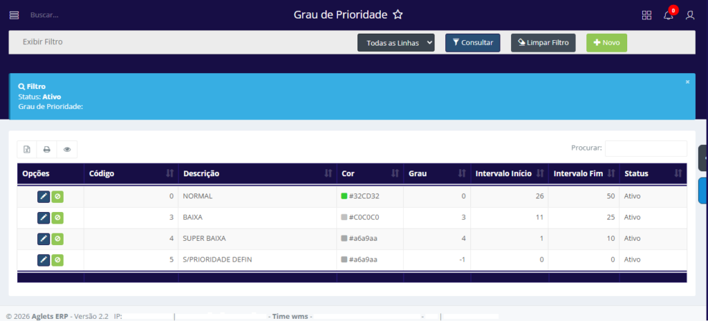 No sistema da Aglets ERP, acesse WMS > Parâmetros > Cadastro > Grau de Prioridade, ou digite “Grau de Prioridade” na barra de pesquisa no topo da página.