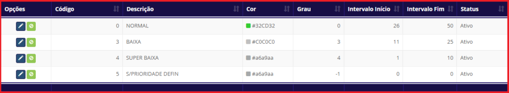 - Cor: Exibe a cor do grau de prioridade.