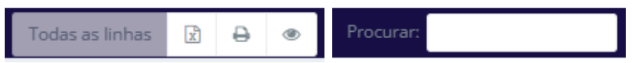 • Procurar: Ao preencher este campo, o usuário pode pesquisar por qualquer informação exibida na tabela, digitando o termo de busca. Esta função atua como um filtro rápido para a tabela, retornando os resultados da pesquisa instantaneamente sobre as linhas já visíveis de uma consulta feita anteriormente.