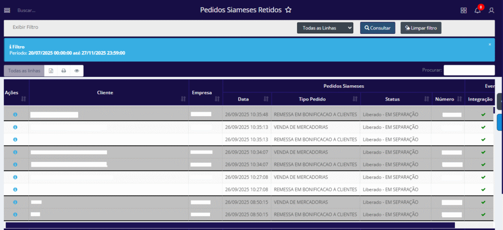Ao acessar a tela Pedidos Siameses Retidos, é possível visualizar todos os pedidos siameses retidos no sistema por meio do filtro disponível, que conta com três campos destinados a auxiliar o usuário nas consultas: