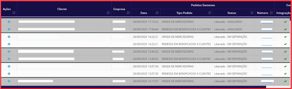 Visão geral da tela Pedidos Siameses Retidos