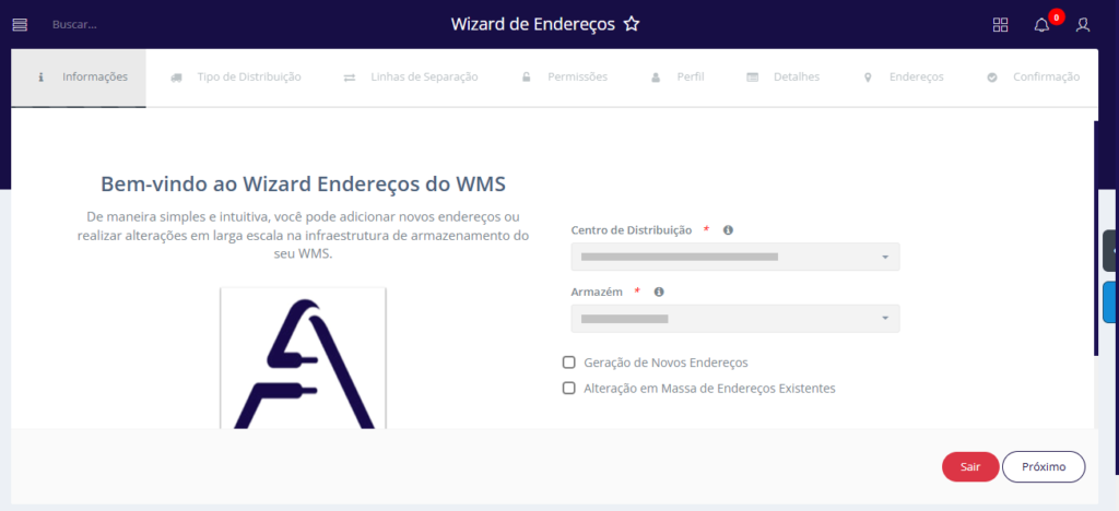 A tela Wizard de Endereços no sistema Aglets ERP tem como objetivo gerar novos endereços para o armazém, bem como realizar a alteração em massa dos endereços já existentes.
