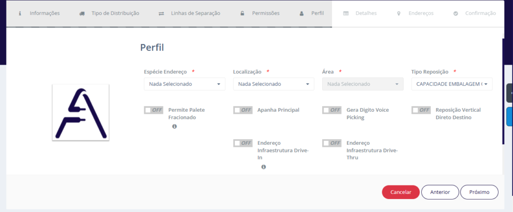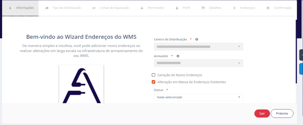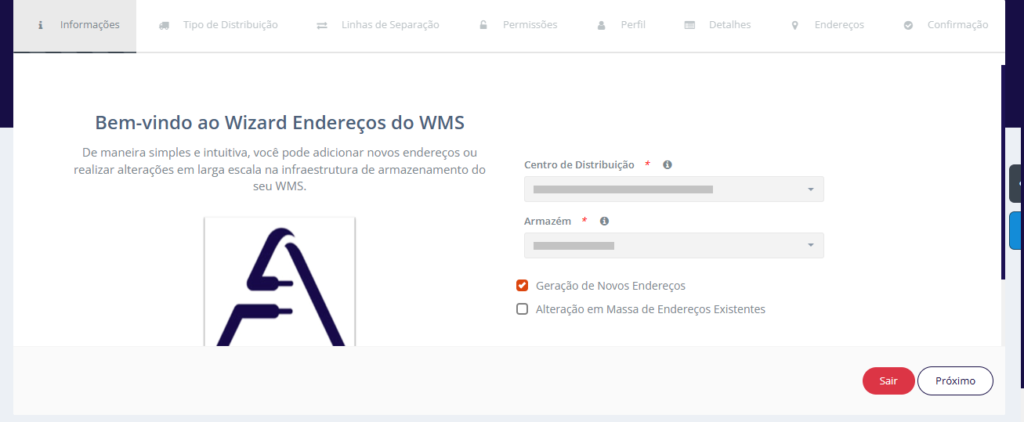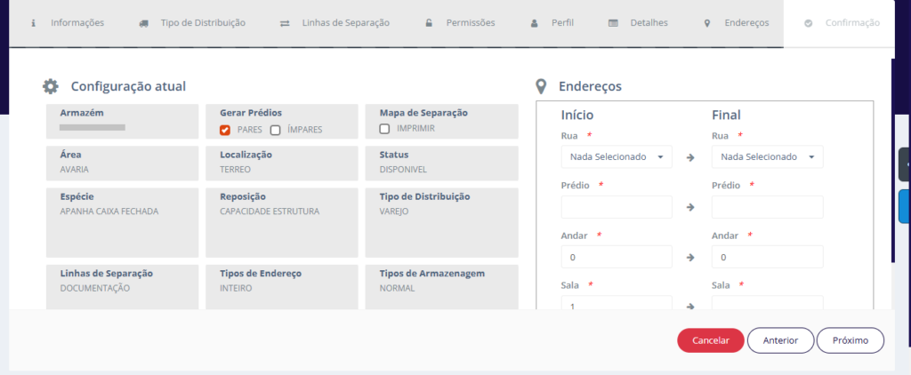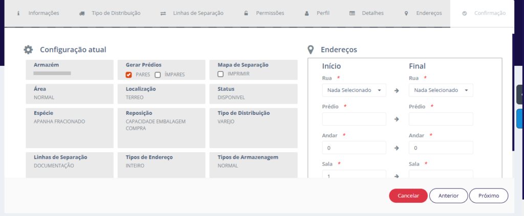 O processo tem início com o preenchimento dos campos Centro de Distribuição e Armazém, que definem o local onde os endereços serão criados.
