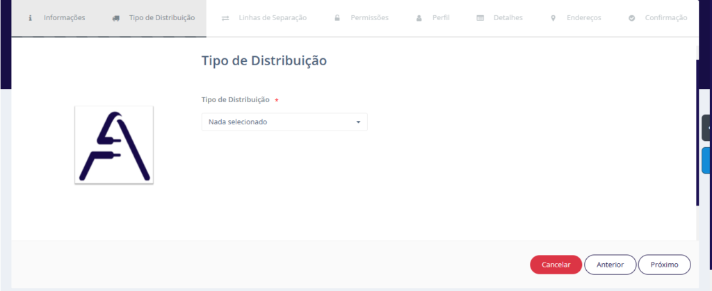 Por exemplo, após o preenchimento dos campos da aba Informações, a aba Tipo de Distribuição é automaticamente disponibilizada para continuidade do processo. O mesmo comportamento se repete para as demais etapas do Wizard.