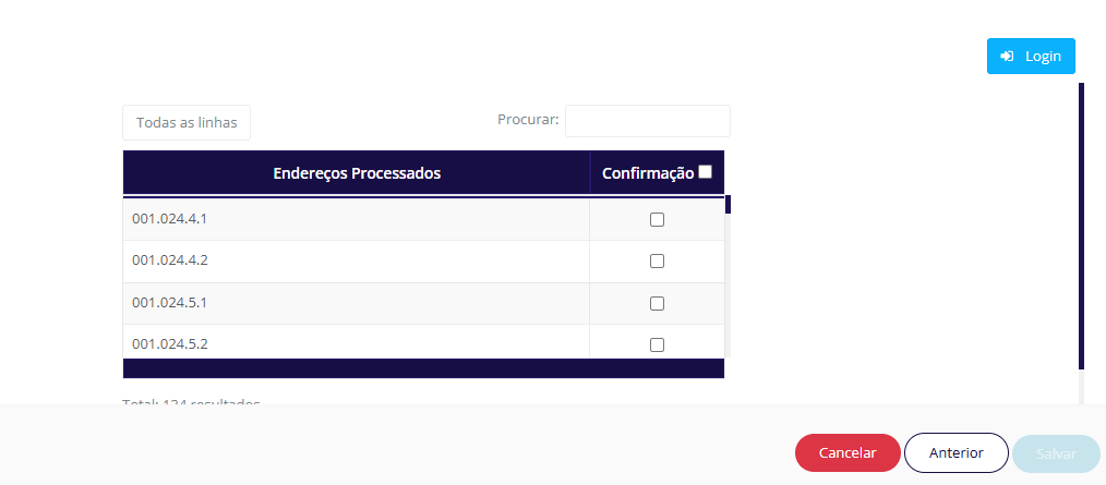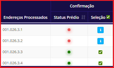 - Selecionados: Exibe a quantidade de endereços selecionados conforme o status.